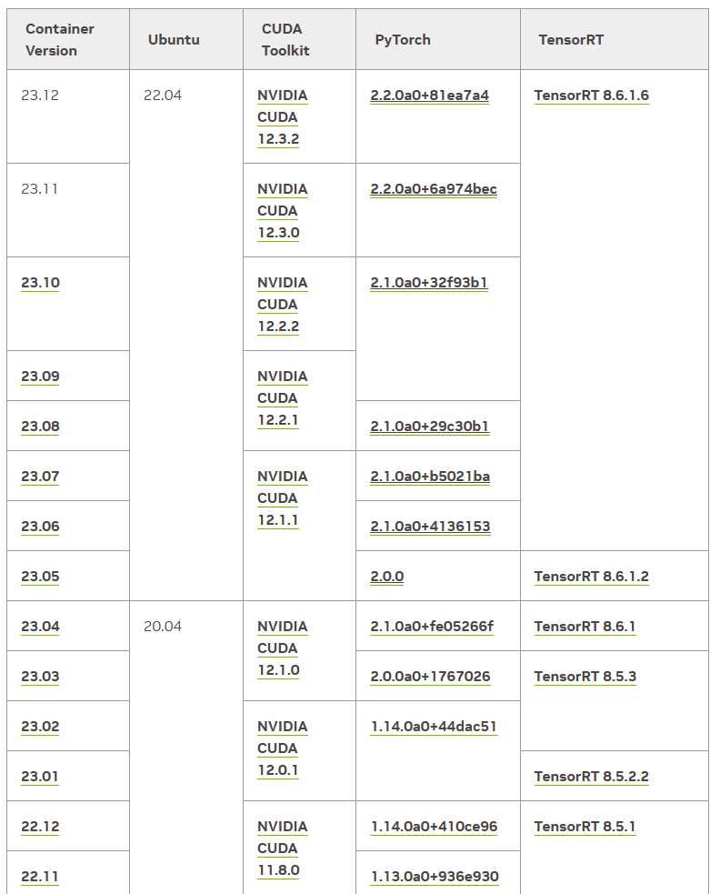 - 23.02 が PyTorch 1.x 系列の最新版。ただし、Python3.8 となる。