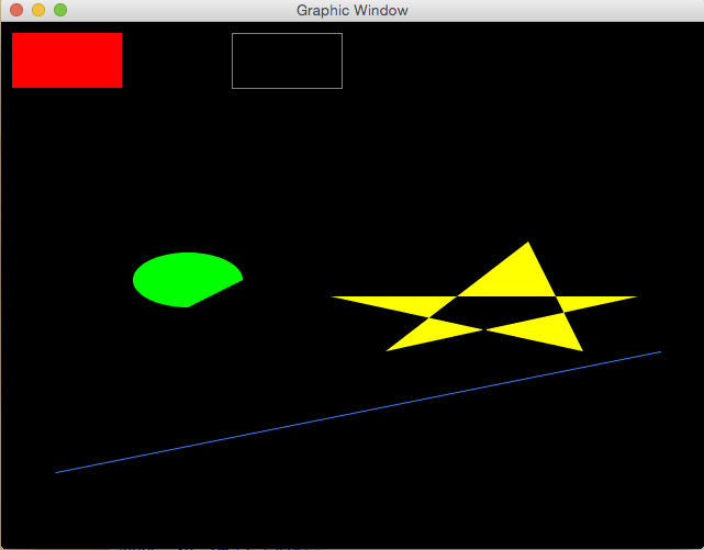 import java.util.*; import java.awt.*; import java.awt.geom.*; public class Sample01 { public static void main(String[] args) { ToyGraphics tg = new ToyGraphics(); tg.g2d.setColor(new Color(255,0,0)); tg.g2d.fill(new Rectangle(10,10,100,50)); tg.g2d.setColor(new Color(128,128,128)); tg.g2d.draw(new Rectangle(210,10,100,50)); tg.g2d.setColor(new Color(0,255,0)); tg.g2d.fill(new Arc2D.Double(120,210,100,50,0,270,Arc2D.CHORD)); tg.g2d.setColor(new Color(55,128,255)); tg.g2d.draw(new Line2D.Double(50,410,600,300)); int[] xp = { 480, 350, 580, 300, 530 }; int[] yp = { 200, 300, 250, 250, 300 }; tg.g2d.setColor(new Color(255,255,0)); tg.g2d.fill(new Polygon(xp,yp,xp.length)); tg.repaint(); } } |