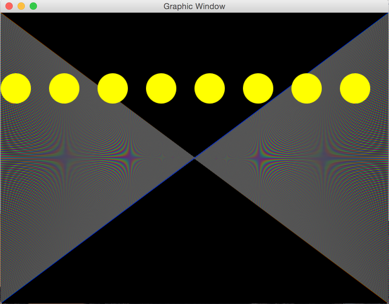 import java.util.*; import java.awt.*; import java.awt.geom.*; public class Sample02 { public static void main(String[] args) { ToyGraphics tg = new ToyGraphics(); for (int y=0; y<480; y++) { int i = y % 3; if (i == 0) tg.g2d.setColor(new Color(255,0,0)); else if (i == 1) tg.g2d.setColor(new Color(0,255,0)); else tg.g2d.setColor(new Color(0,0,255)); tg.g2d.draw(new Line2D.Double(0,y,639,479-y)); } for (int x=0; x<600; x+=80) { tg.g2d.setColor(new Color(255,255,0)); tg.g2d.fill(new Arc2D.Double(x,100,50,50,0,360,Arc2D.CHORD)); } tg.repaint(); } } |